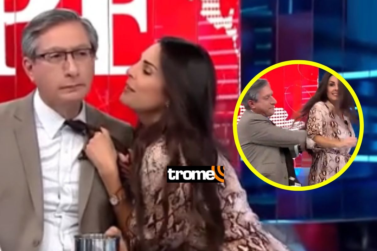 Federico Salazar evidenció toda su incomodidad luego que Rebeca Escribes le jaloneara la corbata y le quitara los lentes luego de bailarle escandalosamente y no dudó el ‘botarla’ de su set.