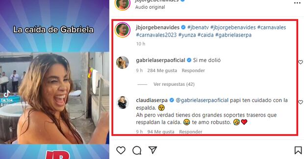 “Papi (por Gabriela Serpa) ten cuidado con la espalda. ¡Ah! pero verdad tienes dos grandes soportes traseros que respaldan la caída. Te amo robusto”, expresó Claudia.