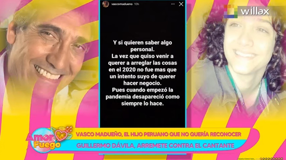 Guillermo Dávila fue confirmado como nuevo jurado del reality ‘La Voz Perú', cuya nueva temporada se emitirá pronto en Latina. Sin embargo, el hijo peruano que el cantante no quiso reconocer y negó por muchos años, no dudó, no solo en mostrarse en contra de su llegada al Perú. Vasco Madueño, el nombre del hijo del venezolano, arremetió con todo contra el intérprete de ‘Me fascina’ y ‘Cuando se acaba el amor’ y lo acusa de ser un ‘cobarde’ y de prometer cosas que nunca cumplió.