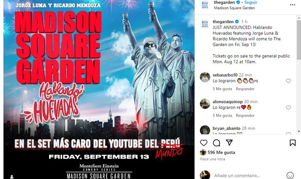 “JUST ANNOUNCED: Hablando Huevadas featuring Jorge Luna & Ricardo Mendoza will come to The Garden on Fri, Sep 13! / RECIÉN ANUNCIADO: ¡Hablando Huevadas con Jorge Luna y Ricardo Mendoza llegará a The Garden el viernes 13 de septiembre!”, dice el post que acompaña una imagen promocional del evento.