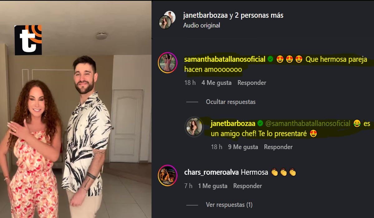 Sin embargo, Janet aclaró la situación. En respuesta a Batallanos, puntualizó: “Samantha, es un amigo chef, te lo presentaré”, negando de esa forma que el hombre que aparece a su lado sea su pareja.