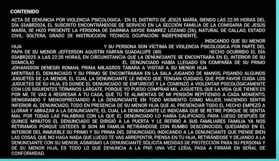 Ramírez afirmó que todo sucedió en frente de su pequeña hija: “Empezó a llorar y abrazar a la denunciante, por lo que le pidió a Farfán que se retire”.
