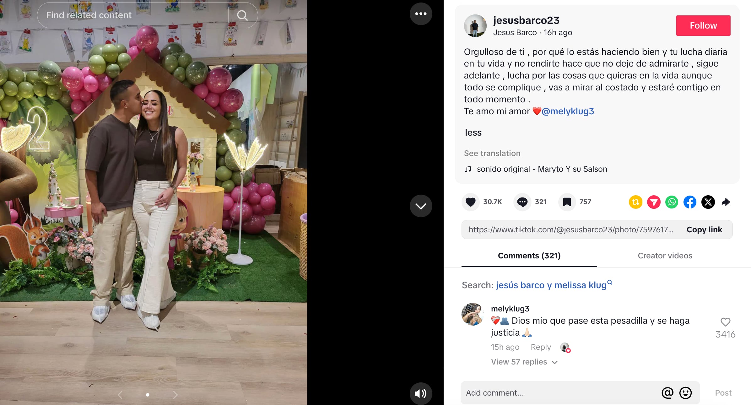 YA NO SE ESCONDE. Jesús Barco compartió un video de TikTok donde le dedicó unas amorosas palabras a Melissa Klug, quien en estos momentos atraviesa un duro momento debido a Samahara Lobatón.