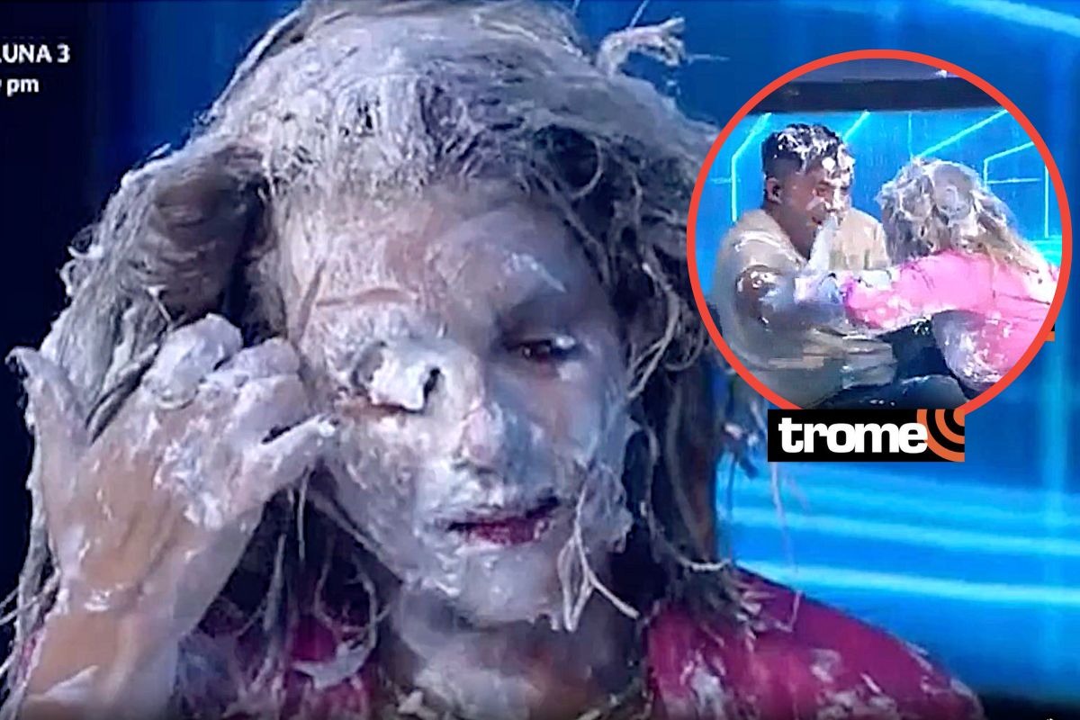 Se las cobró toditas. Johanna San Miguel terminó embarrada de torta tras un fuerte y divertido enfrentamiento en vivo que tuvo con Renzo Schuller, su compañero de conducción en Esto es guerra, de quien dijo era la única conducción que había para animar el reality.