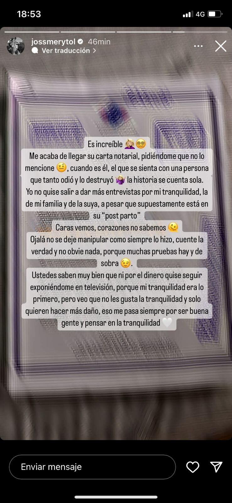 En otro momento, Jossmery Toledo aclaró que no quiso dar una entrevista a Magaly Medina porque puso primero su tranquilidad y la situación de la familia de Paolo Hurtado, ya que Rosa Fuentes acaba de dar a luz.