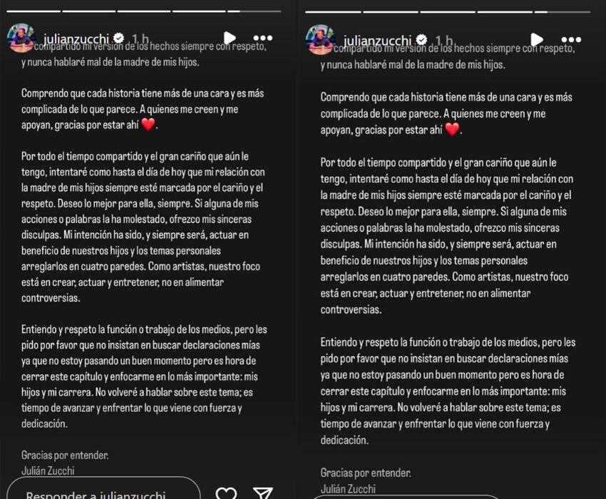 Julián Zucchi y el comunicado que envió en su cuenta de Instagram