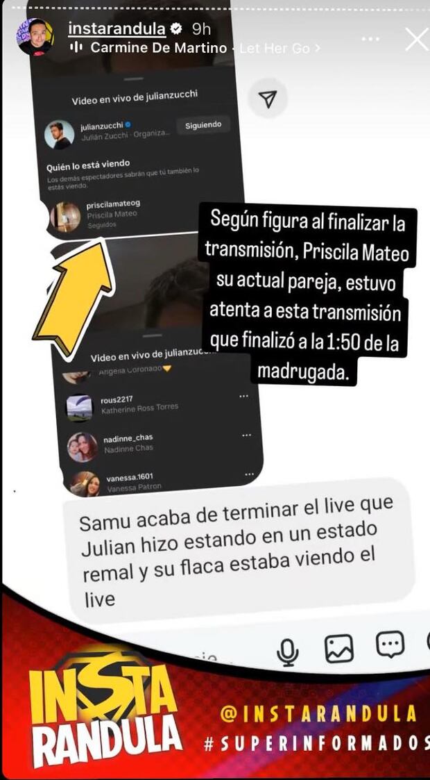 El portal de Instarándula evidenció que Priscila Mateo, la actual saliente de Julián Zucchi estuvo como espectadora de su live.