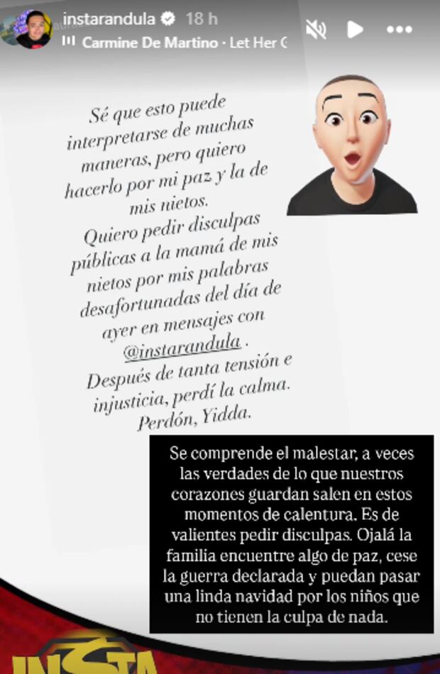 “Sé que esto puede interpretarse e muchas maneras pero quiero hacerlo por mi paz y la de mis nietos. Quiero pedir disculpas públicas a la mamá de mis nietos por mis palabras desafortunadas del día de ayer en mensajes con Instarándula”, dijo María Laura Zucchi.