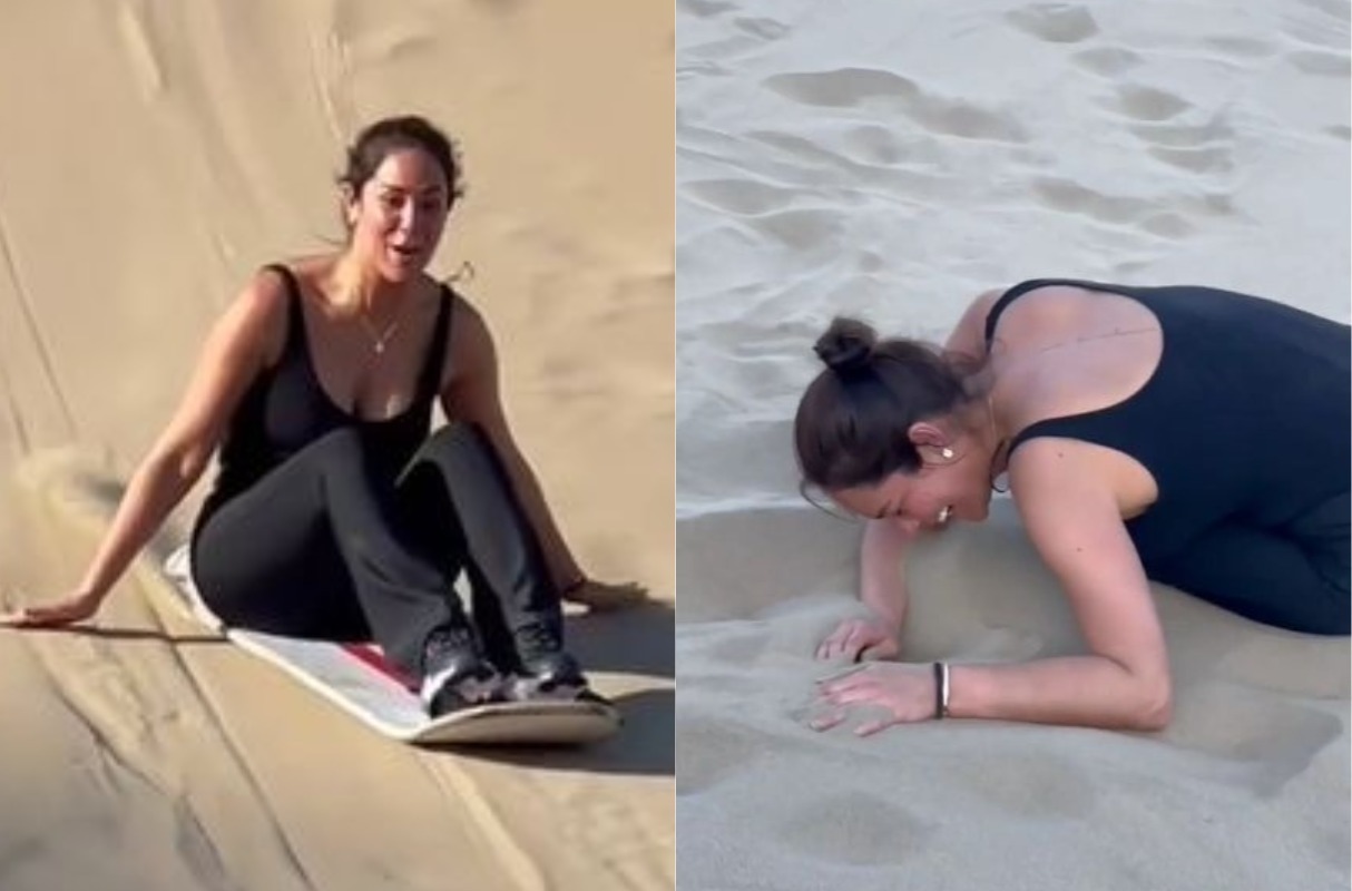 Pero el hecho anecdótico llegó después, en un video separado en el que Karen Schwarz aparece sentada sobre la tabla de sandboard y, al momento de descender, tiene un traspié y termina en la arena después de dar una vuelta.