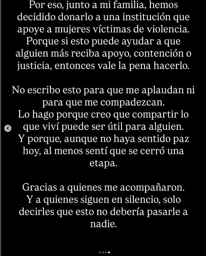 “Ese dinero no me hace sentir mejor, no borra lo vivido, no repara lo que me pasó (...) Si esto puede ayudar a que alguien más reciba apoyo, contención o justicia, entonces vale la pena hacerlo”, expresó.