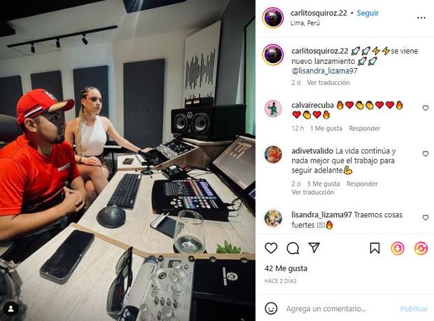 Las sospechas han iniciado debido a que la cubana viene usando sus redes sociales para impulsar el lanzamiento de su nueva canción. En ese sentido, compartió en sus Stories de Instagram un post del productor musical y pianista Carlitos Quiroz, en el que aparecen trabajando en un estudio de grabación.