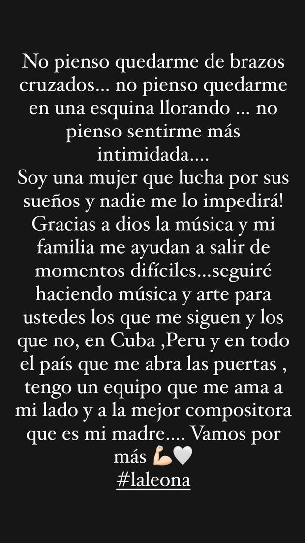 “Gracias a Dios la música y mi familia me ayuda a salir de momentos difíciles... Seguiré haciendo música y arte para ustedes los que me siguen y los que no, en Cuba, Perú y en todo el país que me abra las puertas. Tengo a un equipo que me ama a mi lado y a la mejor compositora que es mi madre... Vamos por más”, finalizó el mensaje que firma como ‘La Leona’.