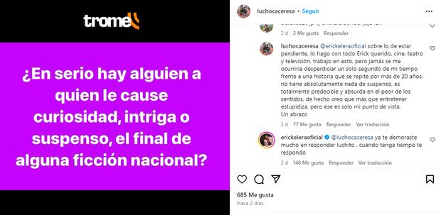“¿En serio hay alguien a quien le cause curiosidad, intriga o suspenso, el final de alguna ficción nacional?”, escribió el polémico actor Lucho Cáceres. Inmediatamente, Erick Elera argumentó diciéndole que su atención ya la tiene.
