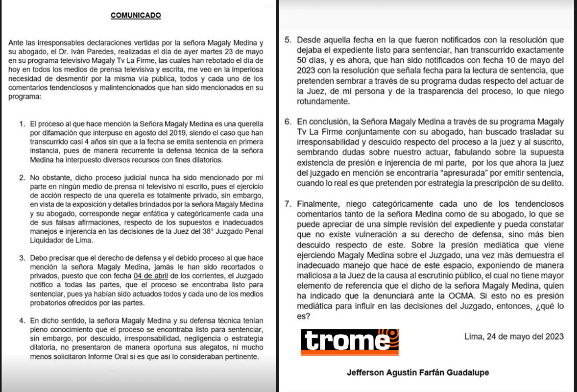 El exjugador de Alianza Lima emitió un comunicado para precisar que Magaly y su abogado Iván Paredes, en un afán de defenders,. Según Farfán, se busca realizar una presión mediática para que influya en las decisiones del Juzgado.