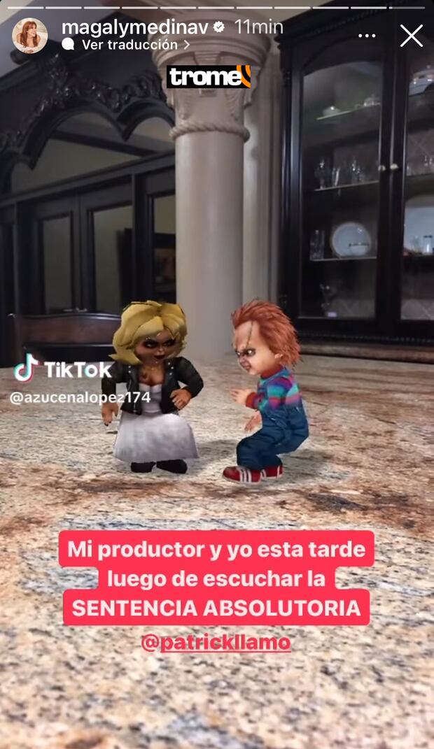 “Mi productor y yo esta tarde luego de escuchar la sentencia absolutoria”, escribió junto a la imagen de Chucky y su novia bailando. Sin embargo, esta imagen fue eliminada para luego compartir la noticia donde Trome informaba.