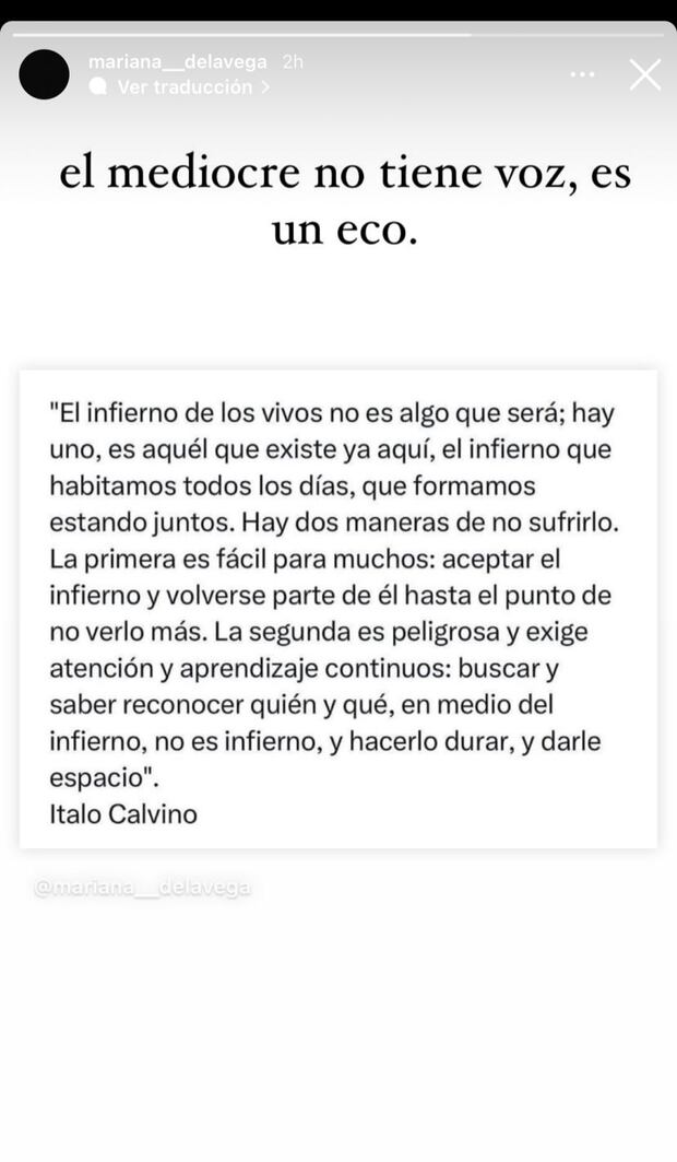 “El mediocre no tiene voz, es un eco. El infierno de los vivos no es algo que será; hay uno, es aquél que existe ya aquí, el infierno que habitamos todos los días, que formamos estando juntos. Hay dos maneras de no sufrirlo. La primera es fácil para muchos: aceptar el infierno y volverse parte de él hasta el punto de no verlo más. La segunda es peligrosa y exige atención y aprendizaje continuos: buscar y saber reconocer quién y qué, en medio del infierno, no es infierno, y hacerlo durar, y darle espacio”, escribió Mariana de la Vega en sus historias de IG.