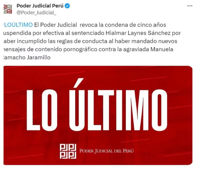 “El Poder Judicial revoca la condena de cinco años suspendida por efectiva contra Hialmar Laynes Sánchez por haber incumplido las reglas de conducta al mandar nuevos mensajes de contenido pornográfico contra la agraviada Manuela Camacho Jaramillo”.