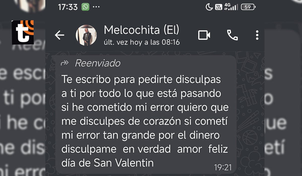 “Te escribo para pedirte disculpas a ti por todo lo que está pasando, si he cometido un error quiero que me disculpes de corazón, si cometí un error tan grande por el dinero, discúlpame en verdad amor. Feliz día de San Valentín”, dice el texto que le envió por WhatsApp.