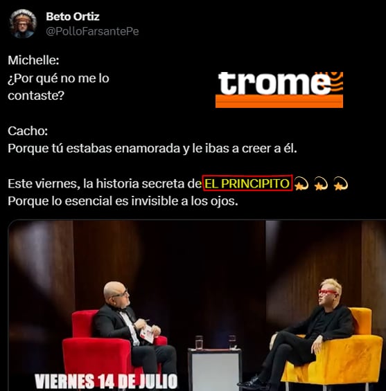 Esta declaración habría sido confirmada por el propio Beto Ortiz, quien tuiteó lo siguiente: “Este viernes, la historia secreta de EL PRINCIPITO. Porque lo esencial es invisible a los ojos”.
