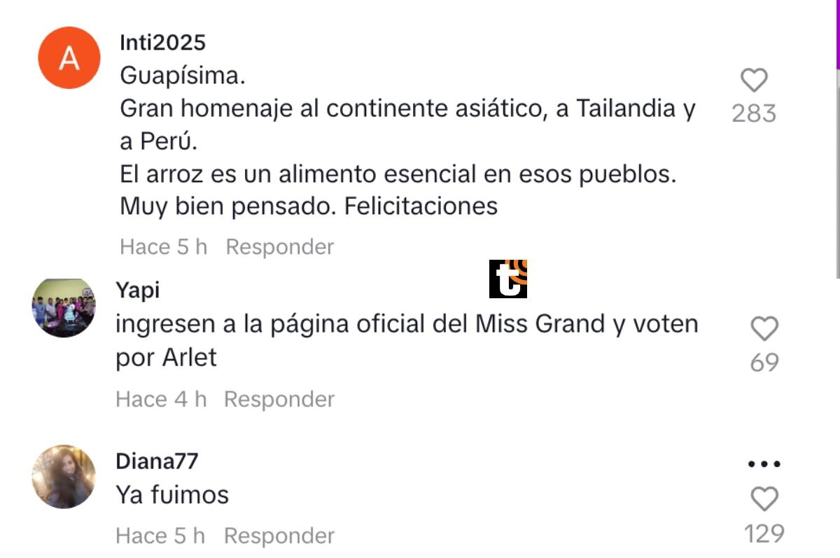 “Ya fuimos”, “Fabulosa con todo lo que se pone, pero porque no le dan lo que ella se merece”, “Guapísima. Gran homenaje al continente asiático, a Tailandia y a Perú”, “Aunque se ponga un trapo, esa es la actitud, ella lo hace impresionante”, fueron algunos de los mensajes.