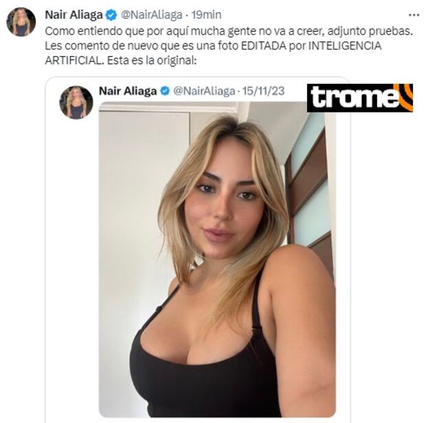 A fin de aclarar la denuncia, la periodista Nair Aliaga compartió la fotografía original que se está viendo editada a raíz de la inteligencia artificial.