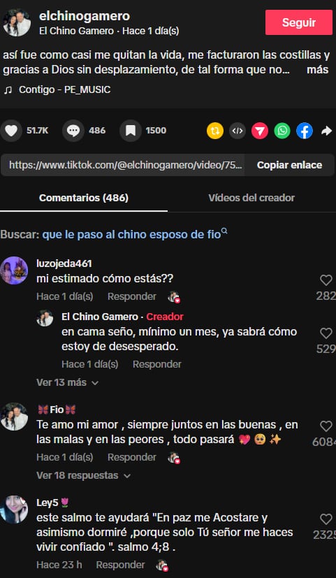El mismo ‘padre’ de Valentino compartió en su cuenta de TikTok, un mensaje sobre su actual estado de salud, después de haber sufrido un accidente en la piscina. Además, resaltó el gran apoyo que recibió de su pareja Fiorella, madre del tiktoker.