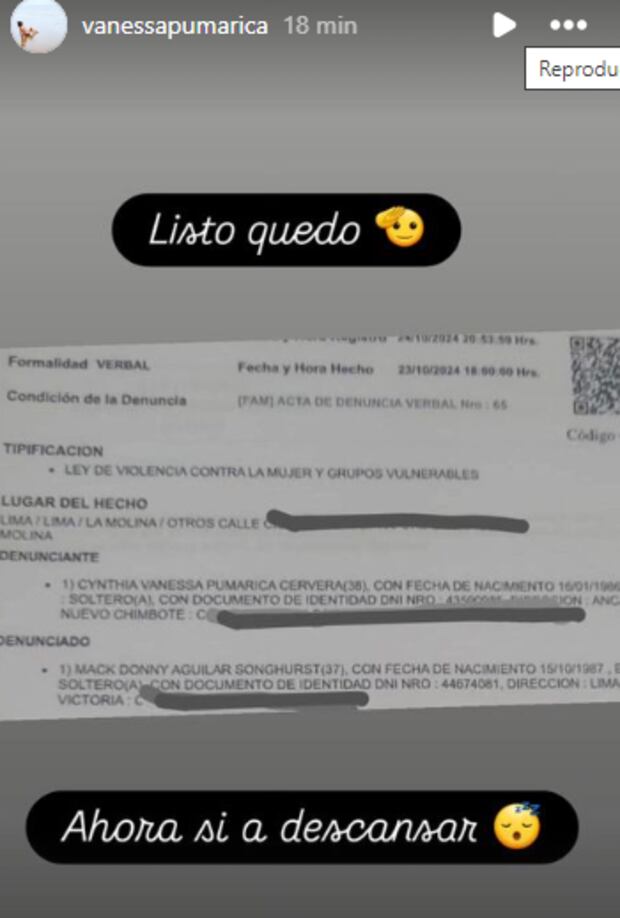 Vanessa Pumarica usó sus redes sociales para mostrar que acudió a la comisaría para denunciar a La Mackyna por violencia contra la mujer. “Listo, quedó. Ahora sí a descansar”, escribió junto a una imagen de la denuncia que entabló contra el amigo de Christian Domínguez.