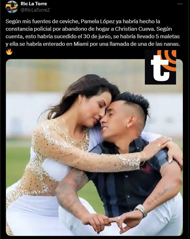 En su publicación, La Torre mencionó: “Según mis fuentes de ceviche, Pamela López ya habría hecho la constancia policial por abandono de hogar a Christian Cueva. Según cuenta, esto habría sucedido el 30 de junio, se habría llevado 5 maletas y ella se habría enterado en Miami por una llamada de una de las nanas”. Esta revelación ha captado la atención de sus seguidores y ha generado una ola de comentarios y especulaciones en las redes sociales.