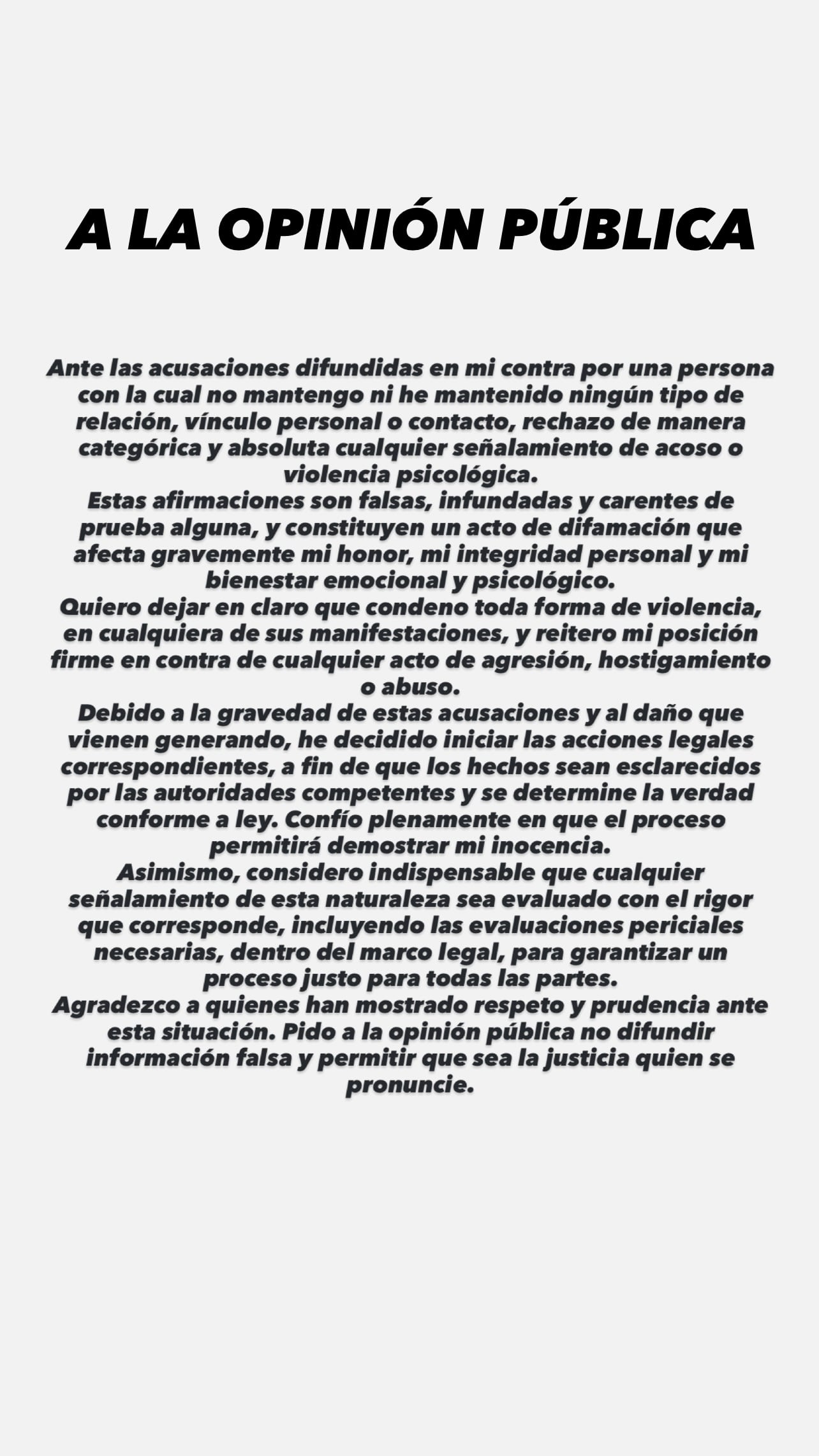 “Ante las acusaciones difundidas en mi contra por una persona con la cual no mantengo ni he mantenido ningún tipo de relación, vínculo personal o contacto, rechazo de manera categórica y absoluta cualquier señalamiento de acoso o violencia psicológica”, sentenció al inicio.