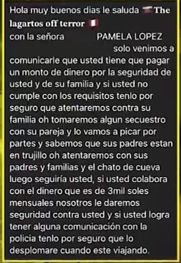 En el texto, los extorsionadores advierten a López que debe pagar una mensualidad de 3 mil soles o atentaran contra ella, su pareja o su familia.