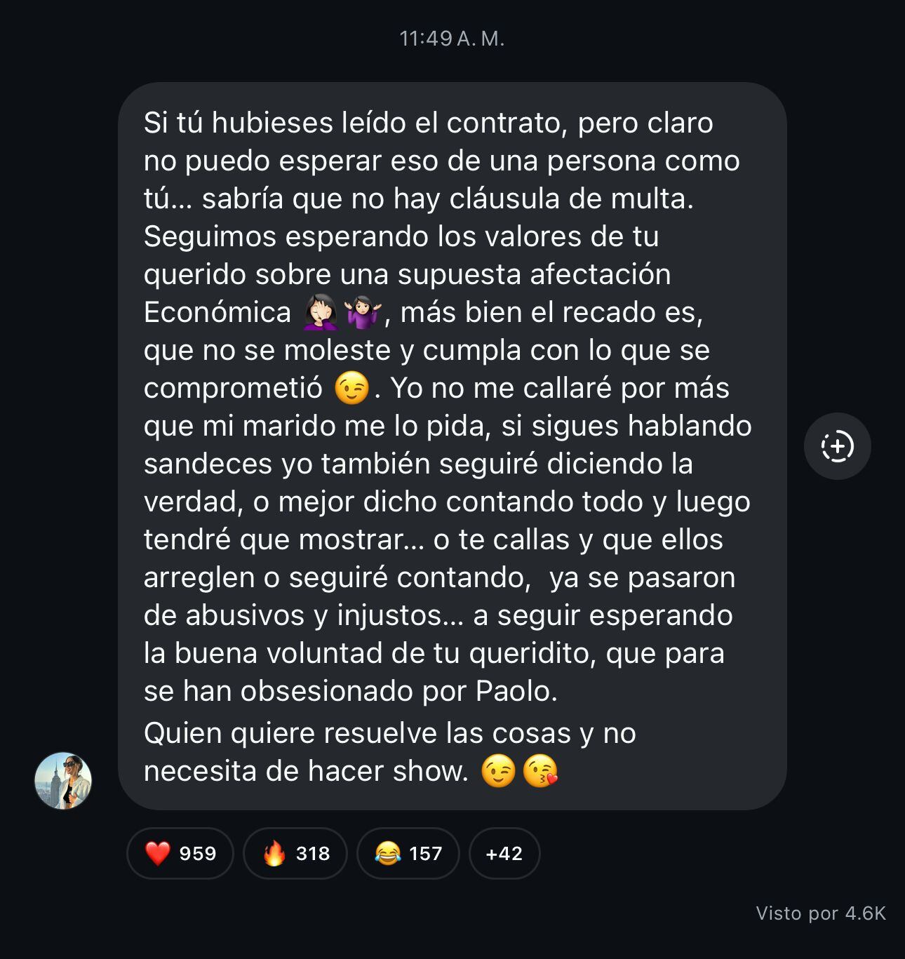“Yo no me callaré por más que mi marido me lo pida, si sigues hablando sandeces yo también seguiré diciendo la verdad, o mejor dicho contando todo y luego tendré que mostrar... o te callas y que ellos arreglen o seguiré contando, ya se pasaron de abusivos y injustos... a seguir esperando la buena voluntad de tu queridito, que para se han obsesionado por Paolo. Quien quiere resuelve las cosas y no necesita de hacer show”, sentenció.