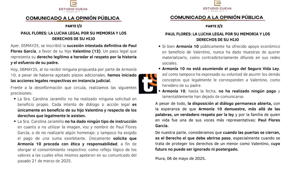 La situación entre la familia del fallecido cantante Paul Flores y la agrupación Armonía 10 ha escalado a instancias legales. Carolina Jaramillo, viuda del intérprete, ha denunciado públicamente una serie de incumplimientos por parte del grupo, especialmente en lo que respecta a los derechos de su hijo Valentino, quien ha sido reconocido legalmente como heredero.