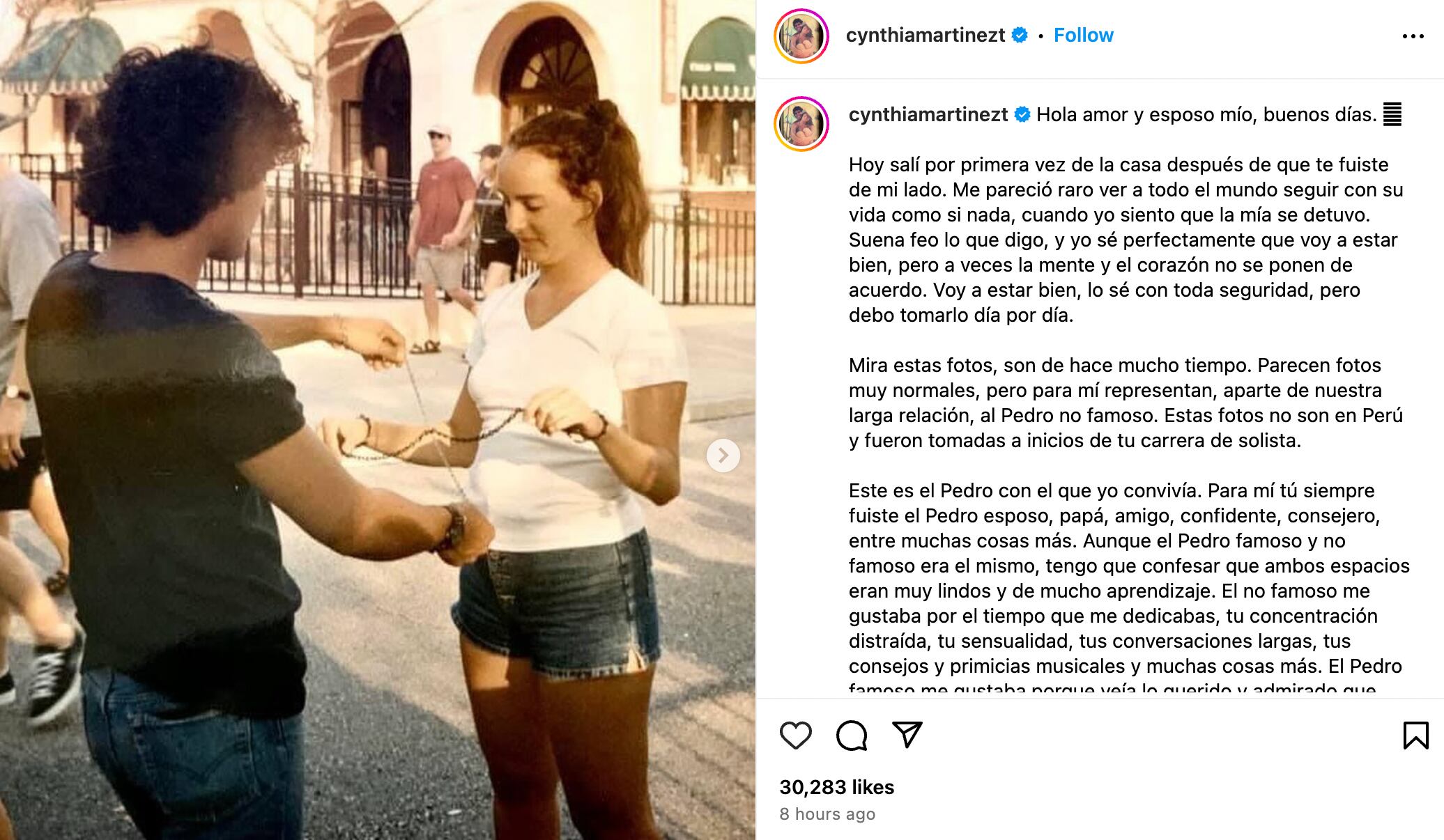 “El no famoso me gustaba por el tiempo que me dedicabas, tu concentración distraída, tu sensualidad, tus conversaciones largas, tus consejos y primicias musicales y muchas cosas más. El Pedro famoso me gustaba porque veía lo querido y admirado que eras, lo bueno y valiente para aceptar a ir a los sitios más raros que yo te pedía, lo sencillo y humilde que eras con todas las personas, lo paciente que eras para saludar y conversar regalando un poquito de felicidad a las personas que te hablaban, mil cosas que no me alcanzarían contar en estas líneas”, dijo.