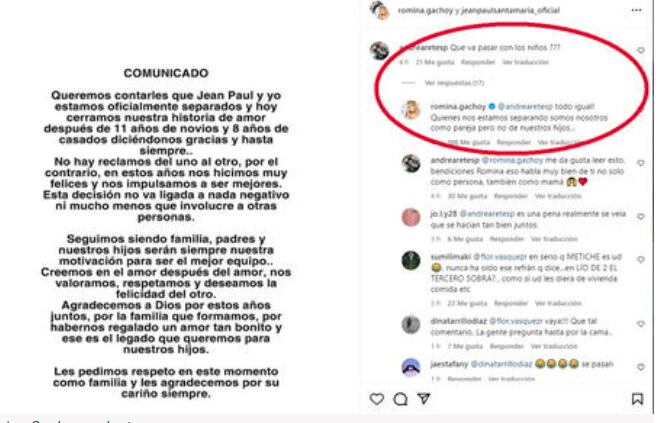Romina Gachoy y Jean Paul Santa María sorprendieron a todos al anunciar el fin de su matrimonio de ocho años. La pareja compartió la noticia de su separación en las redes sociales, y en la publicación también abordaron el tema de sus hijos.