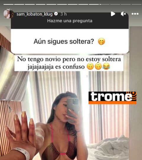 “¿Aún sigues soltera?”, le cuestionó un seguidor, a lo que Samahara respondió para sospresa de los cibernautas: “No tengo novio, pero no estoy soltera. Ja,ja,ja es confuso”, sin entrar en más detalles.