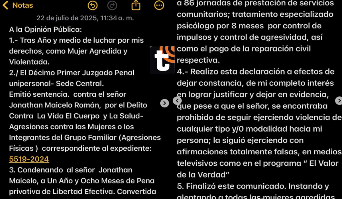 De acuerdo con el mensaje publicado en Instagram, Samantha señaló que el 11.º Juzgado Penal emitió una sentencia que impone a Maicelo “un año y ocho meses de pena privativa de la libertad”, conmutada por “86 jornadas de prestación de servicios comunitarios”.
