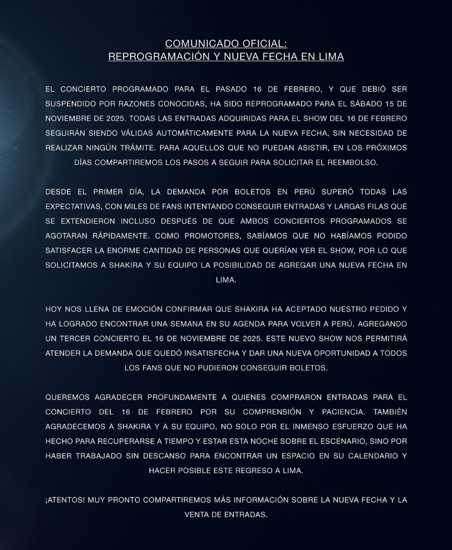 El comunicado informa que el concierto de Shakira del 16 de febrero ha sido reprogramado para el sábado 15 de noviembre. “Todas las entradas adquiridas para ese show serán válidas para la nueva fecha. Para los que no puedan asistir, en los próximos días compartiremos los pasos para solicitar el rembolso”, informaron.