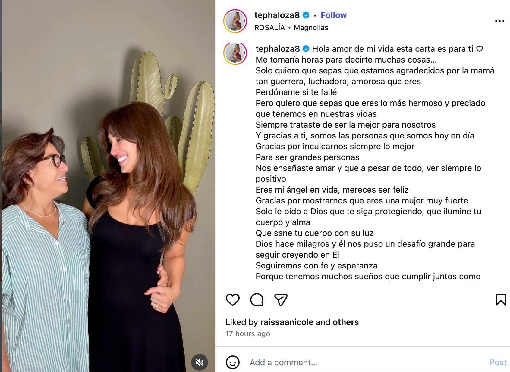 PIDE UN MILAGRO. Tepha Loza publicó un extenso mensaje dedicado a su madre, quien fue diagnosticada con cáncer. La exchica reality comenzó pidiéndole perdón y agradeciéndole por todo.