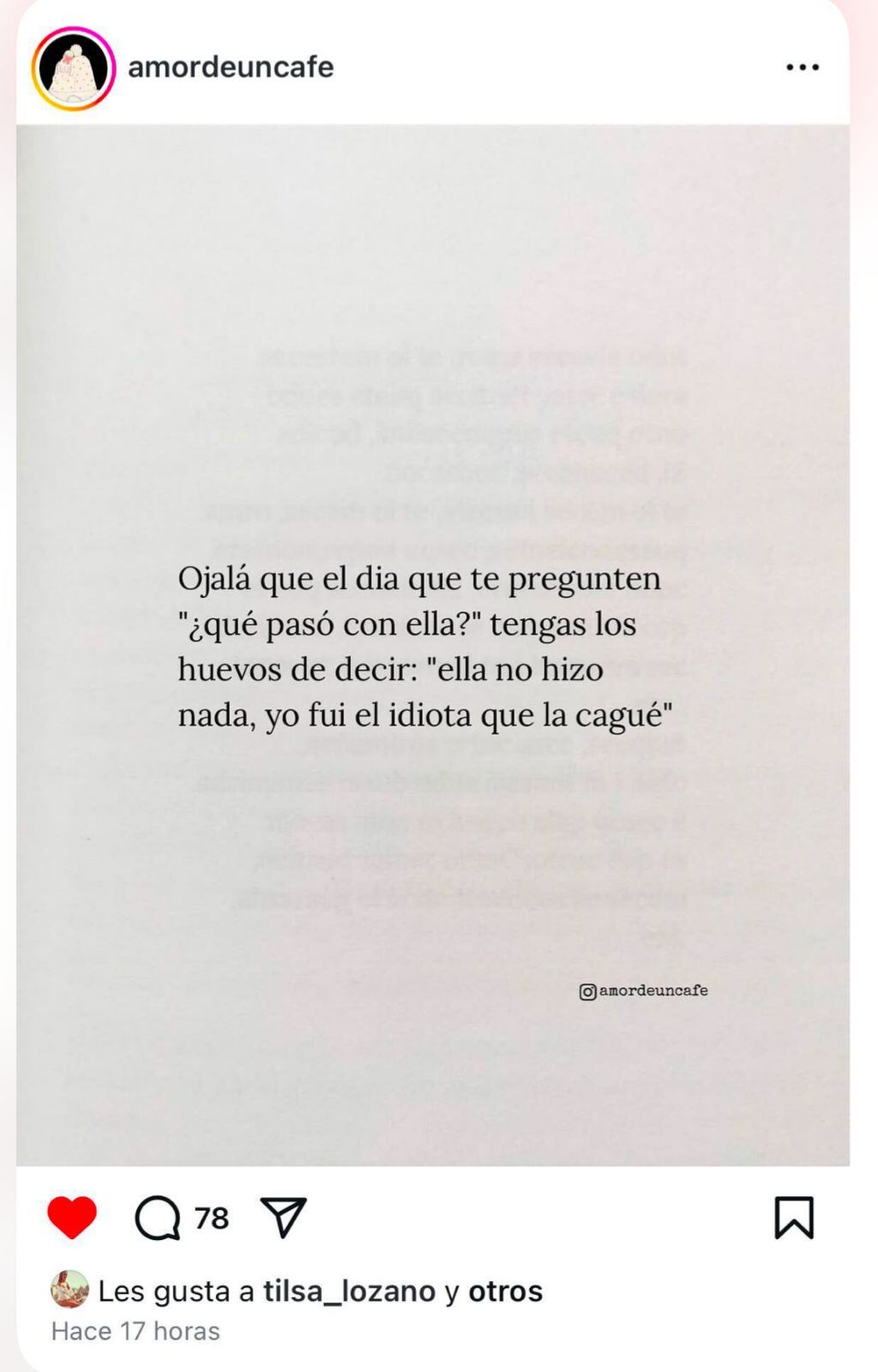“Ojalá que el día que te pregunten “¿Qué pasó con ella?” Tengas los huevos de decir: “Ella no hizo nada, yo fui el idiota que la cagué”, se lee en la publicación.