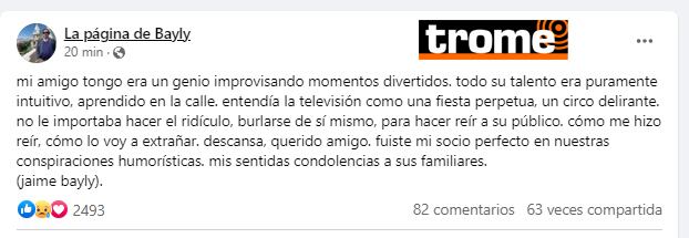 Bayly indicó en su mensaje que Tongo era un genio, a quien no le importaba burlarse de sí mismo para el disfrute del público. Además de expresar sus condolencias para su familia.