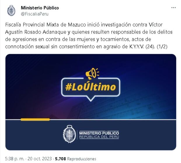 “La Fiscalía Provincial Mixta de Mazuco inició investigación contra Víctor Agustín Rosado Adanaque y quienes resulten responsables de los delitos de agresiones en contra de las mujeres y tocamientos, actos de connotación sexual sin consentimiento en agravio de K.Y.Y.V. (24)”