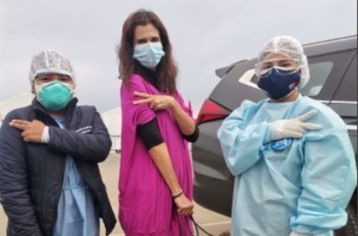 En ambas imágenes, la actriz de “Mi vida sin ti” se luce bastante tranquila e incluso posa al lado de personal médico y asistencial que trabajan en el vacunatorio instalado en la Explanada de la Costa Verde.