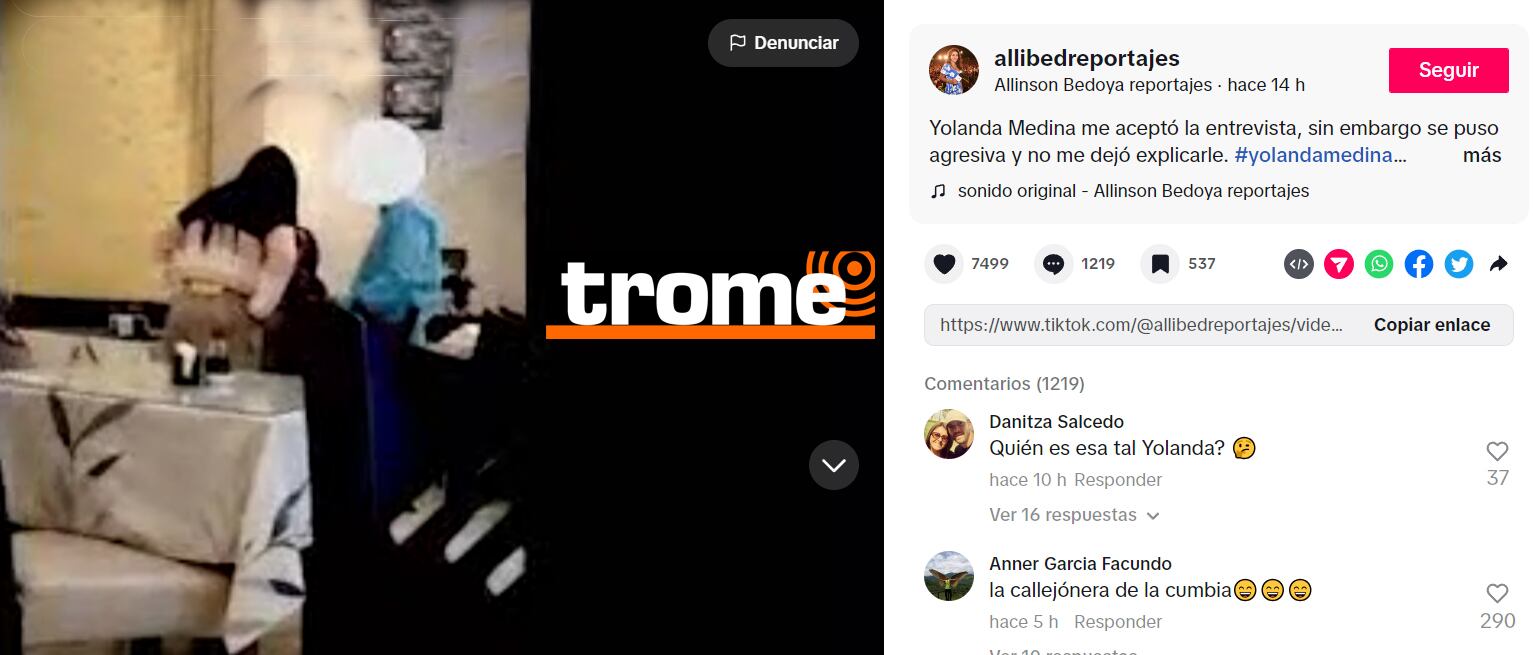 El video compartido por la usuaria Allison Bedoya, quien se identifica como comunicadora, indica lo siguiente: “Yolanda Medina me aceptó la entrevista; sin embargo, se puso agresiva y no me dejó explicarle”.
