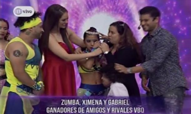Zumba y su quinceañera Ximena fueron al final los que se llevaron el primer lugar de esta segunda temporada de Amigos y Rivales VBQ conducida por Karen Schwarz y Yaco Eskenazi.
