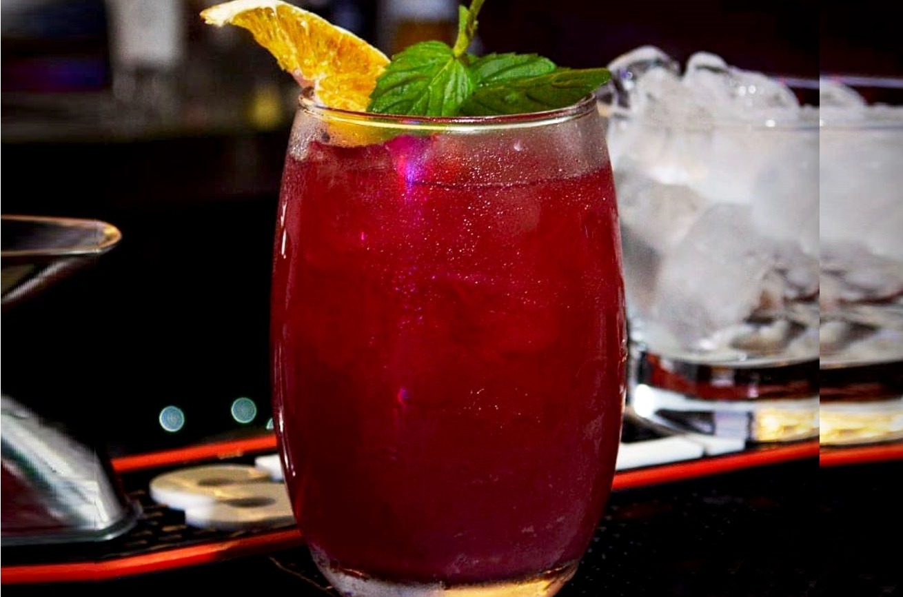 Ingredientes (copa de 500ml): Esencia de maíz morado (2oz), almíbar de piña (2oz), Zumo de maracuyá (1oz), Pisco Quebranta (2oz), 2 Rodajas de piña.