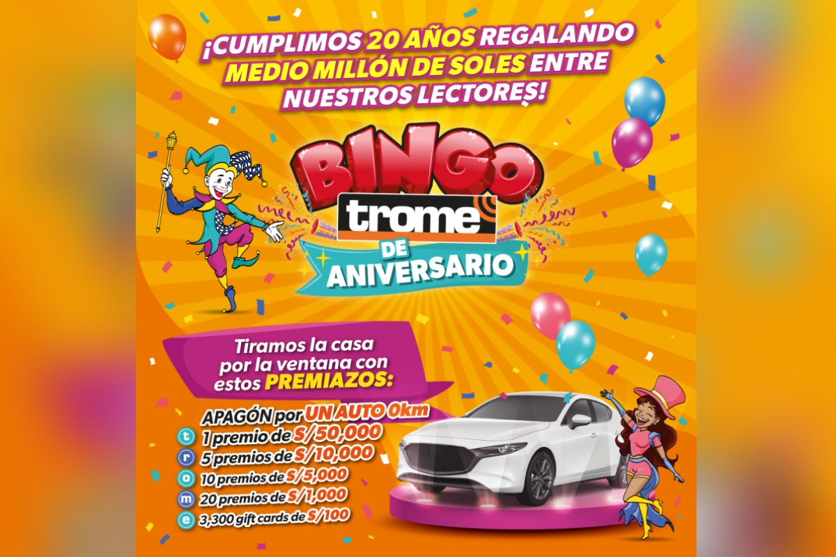 En unos días cumpliremos 20 años brindando la mejor información y no queremos celebrarlo solos porque nos debemos a ustedes, nuestros fieles lectores. Por eso, lanzamos desde este lunes 7 de junio el ‘Gran Bingo Trome de Aniversario’, con el cual tiramos la casa por la ventana, pues daremos ¡medio millón de soles! en premios y un flamante carrazo 0 km.