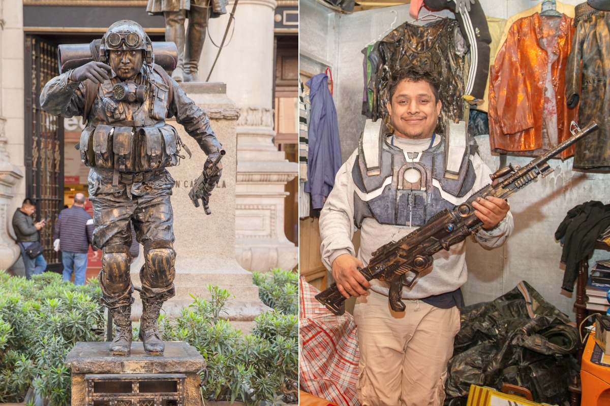 Ser una estatua humana implica grandes sacrificios y él lo sabe. Desde irse a la ‘cachina’ para buscar materiales o prendas que los comerciantes desechan, hasta crear sus disfraces y adaptarlos (algunos pesan más de doce kilos). También debe elaborar su propio maquillaje con una serie de químicos que atentan contra su salud.