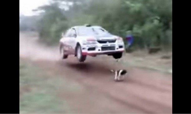 El perro comenzó a correr y los espectadores pensaron que no había duda de que sería atropellado por el piloto al salir de la curva, sin embargo una loma en el camino de tierra provocó que el auto volará justo encima del perro.