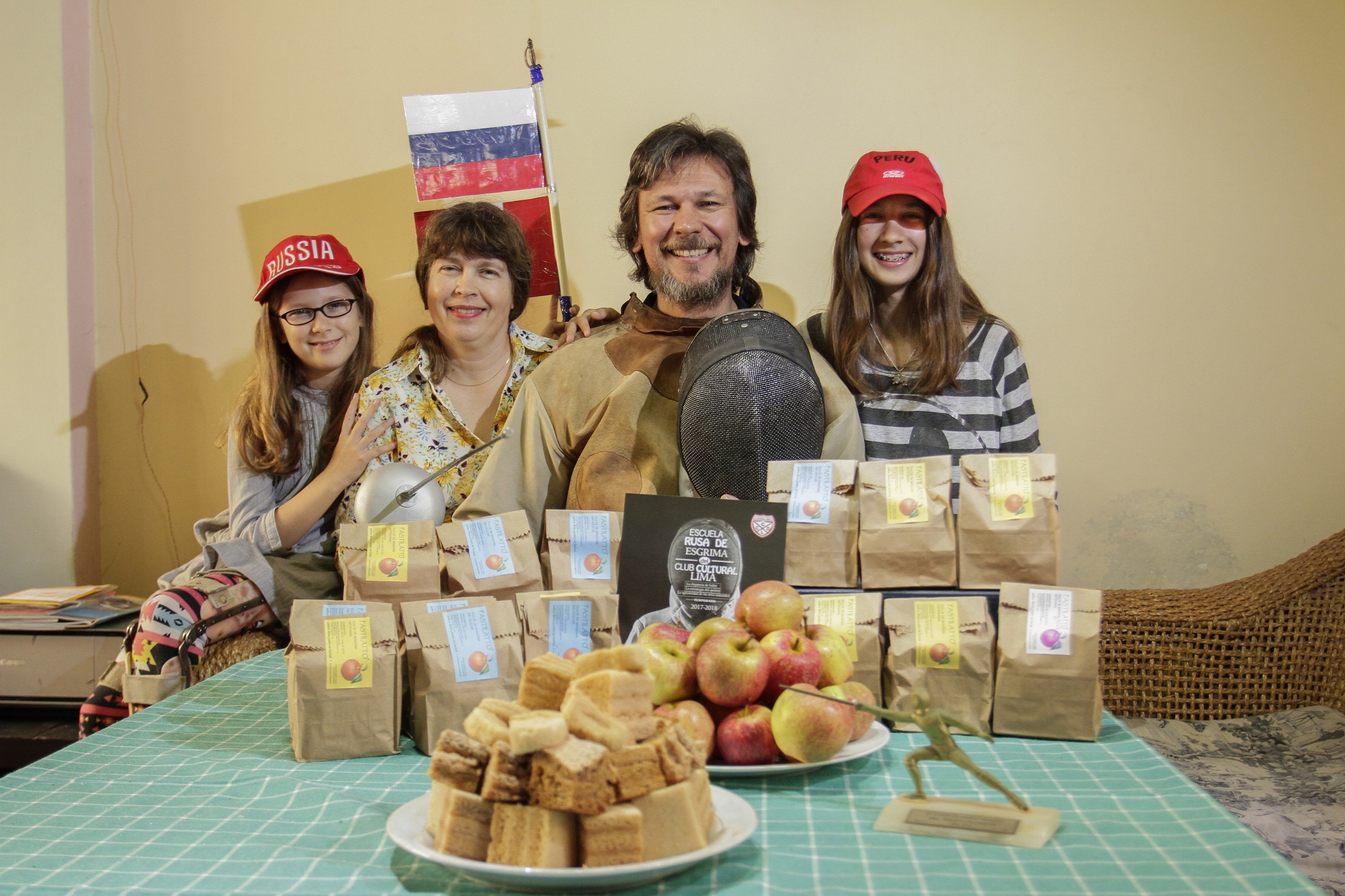 Ellos son Andrey Sladkov (49) y su esposa Tatiana Dikonova (49). Él es profesor de esgrima y llegó al Perú en 2001. Tres años después, regresó a su pueblo Komsomolsk para casarse con la mujer que le dio dos hijas peruanas. Ellos emprendieron aquí una aventura de amor y crecimiento familiar con una empresa que produce un postre tradicional ruso llamado ‘Pastilatto’.