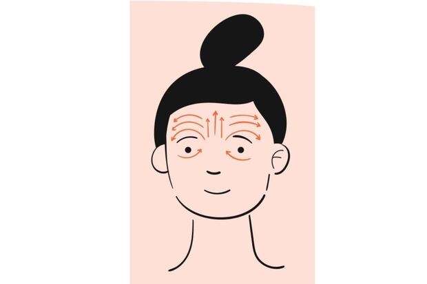 1. Desliza la herramienta de abajo hacia arriba con una ligera presión sobre la frente (como se muestra en la imagen), hazlo por 30 segundos, descansa diez segundos y luego repite la acción unas cinco veces más.